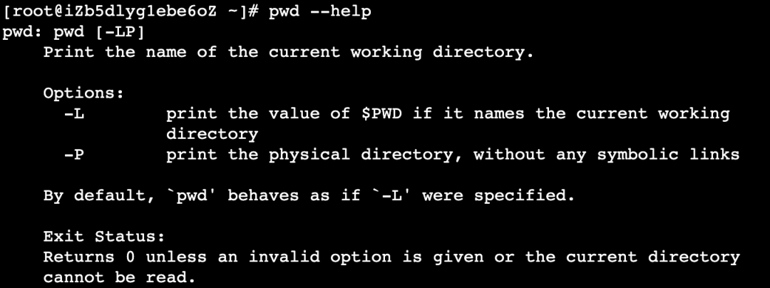 [[email protected] ~]# pwd --helppwd: pwd [-LP]Print the name of the current working directory.Options:-L print the value of $PWD if it names the current workingdirectory-P print the physical directory, without any symbolic linksBy default, `pwd' behaves as if `-L' were specified.Exit Status:Returns 0 unless an invalid option is given or the current directorycannot be read.