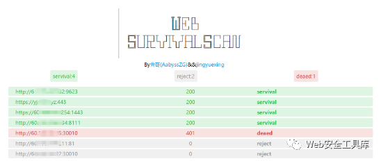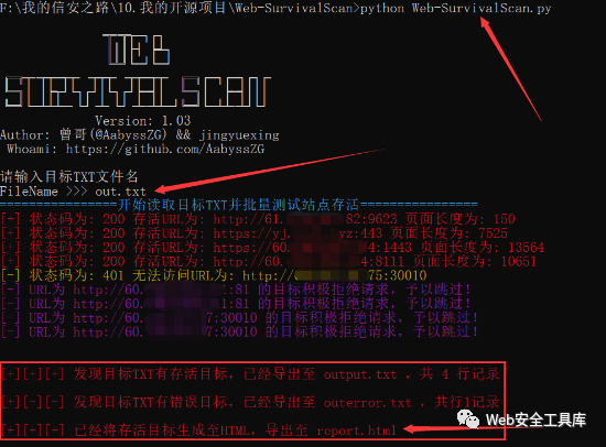 python3 Web-SurvivalScan.py4、跑完后,即可拿到导出的两个文件:output.txt 和 outerror.txt