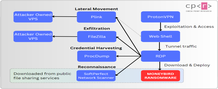 近日,Check Point的研究人员披露了具有伊朗背景的APT组织,Agrius利用一种名为Moneybird的新型勒索软件针对以色列实体的攻击活动。攻击活动中,攻击者首先通过利用服务器中的漏洞获得目标的初始访问权限,然后利用以色列的ProtonVPN节点分发隐藏在“Certificate”文本文件中的ASPXSpy webshell变体。之后,Agrius从ufile.io和easyupload.io等合法文件托管平台获取勒索软件Moneybird的可执行文件。在目前发现的案例中,该勒索软件仅针对路径F:\User Shares的数据进行加密,这表明Moneybird的目标偏向于导致业务中断,而不是锁定计算机。攻击链图如下图所示。