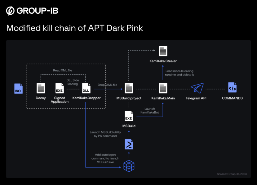 近日,Group-IB的研究人员调查发现,APT组织Dark Pink在新一轮活动中攻击了13个组织,其中5名为新的受害者,活动范围已扩展至比利时、文莱和泰国等地区。据称,Dark Pink自2023年初以来,至少成功实施了两次攻击,并且最近一次的攻击始于2023年4月,而其最新的文件则于5月17日被检测到。以上迹象表明,该组织依旧保持着高度活跃的攻击特征,并不断更新他们的工具以规避防御机制。研究人员表示,在最近的一次攻击活动中,活动感染链始于一个ISO镜像文件,该文件包含多个项目,包括签名文件、诱饵文档和恶意DLL,并且攻击者还通过GitHub和TextBin.net服务来分发有效载荷。其中,诱饵文档具有".docx”扩展名,并带有MS Word图标以诱使受害者打开。一旦执行,便会通过侧加载启动DLL文件,进而最终执行可通过Telegram机器人从攻击者控制的Telegram频道读取和执行命令的工具:KamiKakaBot。经研究人员分析,KamiKakaBot可通过MSBuild实用程序直接加载到内存中,而不存储在文件系统中,并具有控制设备和窃取敏感数据两种功能。在最近一次攻击活动中,KamiKakaBot还使用Webhook的服务通过HTTP协议传输窃取数据。此外,Dark Pink还被观察到利用了不同的LOLBin技术来规避检测。攻击链图如下图所示。
