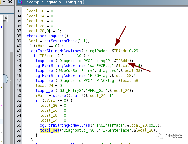 抓取文件后,我使用 Ghidra 进行逆向工程获得了一些乐趣。这是有趣的部分:在“ping.cgi”文件中,我注意到 PingIPAddr参数是直接从用户输入中获取的,没有进行任何适当的清理。从用户输入中获取的PingIPAddr参数被存储以供将来使用tcapi_set函数使用。