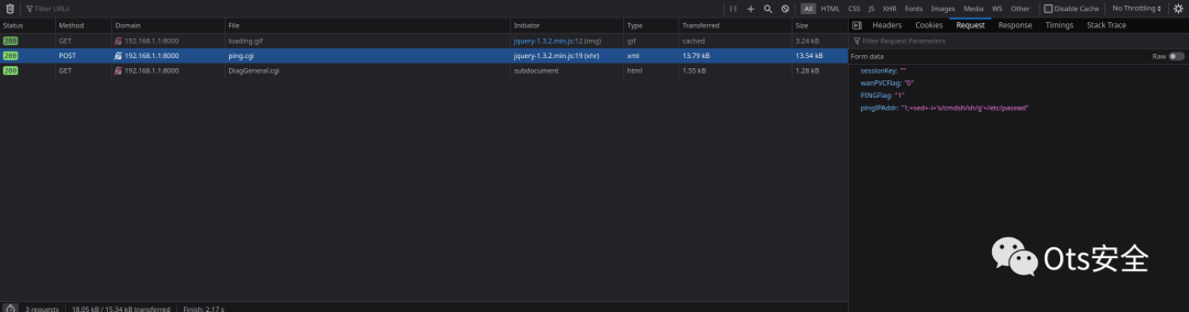 由于我拥有完全的管理员权限,我忍不住深入研究以发现易受攻击的组件。在检查浏览器请求时,我注意到了一些有趣的事情。有两个 CGI 文件,“ping.cgi”和“DiagGeneral.cgi”,是请求的目标。