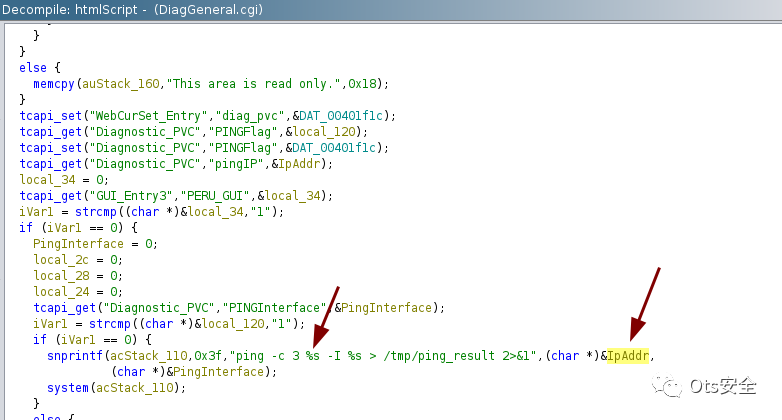 最后,在 DiagGeneral.cgi 文件中,使用tcapi_get函数检索 PingIPAddr 参数,然后直接在系统函数中使用,无需任何清理。此缺陷会产生一个命令注入漏洞,允许在系统上未经授权地执行任意命令。