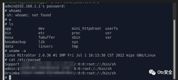 如下图所示,我所做的修改使我能够登录并自由执行“uname”和“cat”等命令