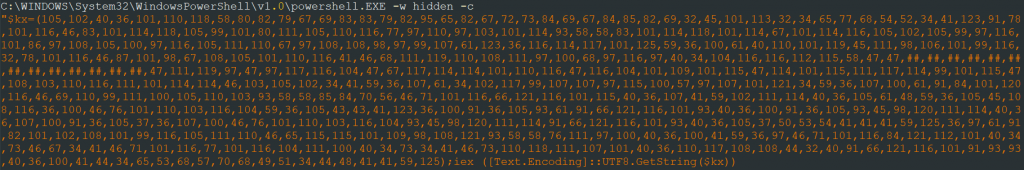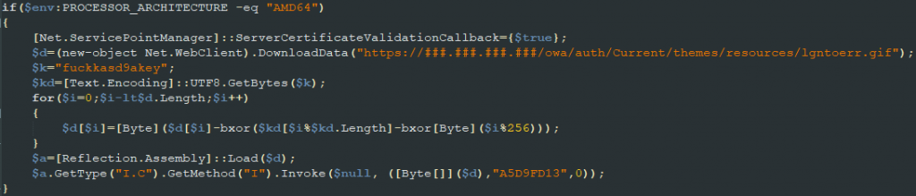 PowerShell脚本的核心功能是启动恶意软件安装进程。为此,PowerShell脚本从远程服务器下载加密有效负载,使用自定义异或加密算法(密钥为“fuckkasd9akey”)对其解密,并将负载加载到内存中:
