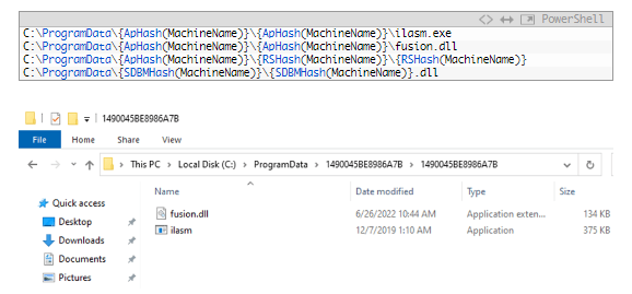 恶意软件的执行进程包括两个加载程序:DLL劫持程序fusion.dll和下一阶段的加载程序{SDBMHash(MachineName)}. DLL。