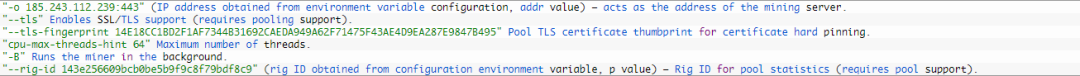 挖矿程序使用(GetEnvironmentVariable)获取进程环境变量配置的值。这些值用于通过以下配置挖掘加密货币: