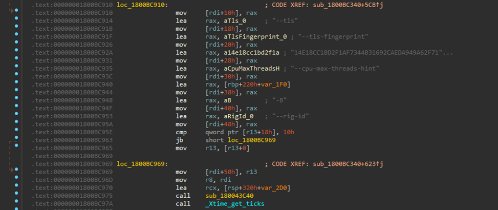 最后,DLL .exe将控制流传递给解密的原始加载器,该加载器在进程内存中映射XMRig挖矿程序(XMRig挖矿程序的DLL文件形式的汇编),然后使用反射加载启动它。