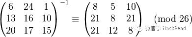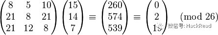 希尔密码(Hill Cipher)是基于线性代数多重代换密码,由Lester S. Hill在1929年发明。每个字母转换成26进制数字:A=0, B=1, C=2…Z=25一串字母当成n维向量,跟一个n×n的矩阵相乘,再将得出的结果MOD26。
