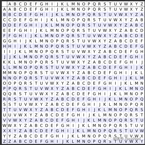 维吉尼亚密码(Vigenère Cipher)是在单一恺撒密码的基础上扩展出多表代换密码,根据密钥(当密钥长度小于明文长度时可以循环使用)来决定用哪一行的密表来进行替换,以此来对抗字频统计。