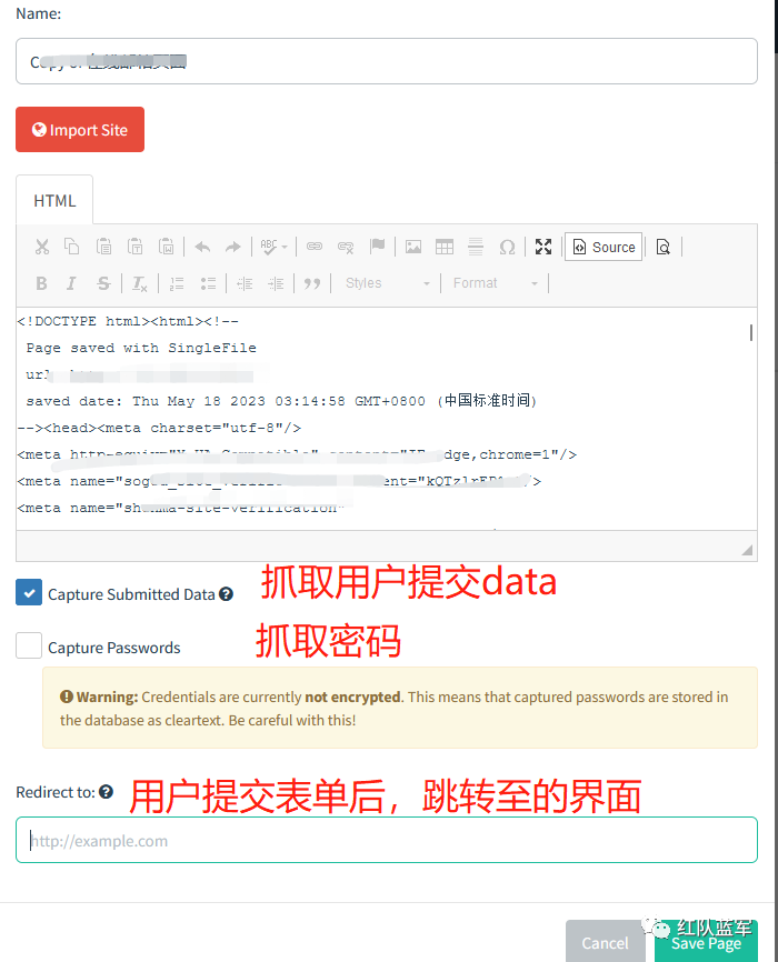 直接在landing pages页面导入界面,gophish会自行仿造目标网站。此处碰到两个问题点,1.网站项目缺失,显示如下