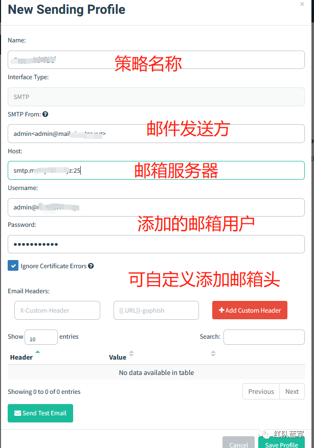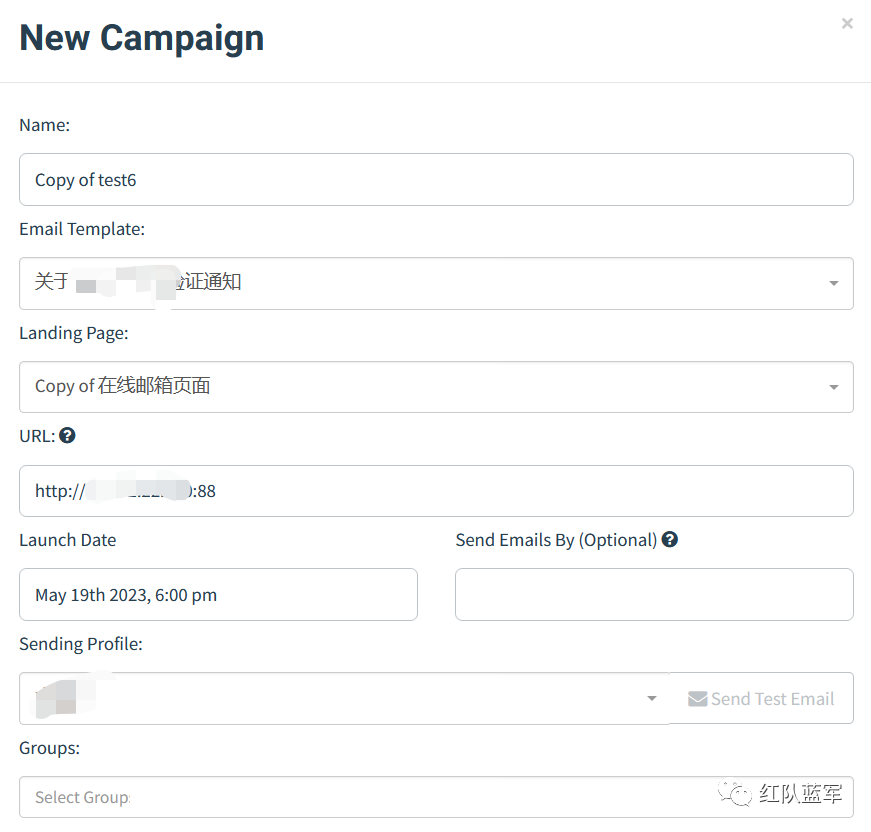 Launch Date和Send Emails By用来控制邮件发送时间,gophish会根据两个时间间隔长度,来调控邮件发送的速率,间隔越长相对的发送速率就越慢。