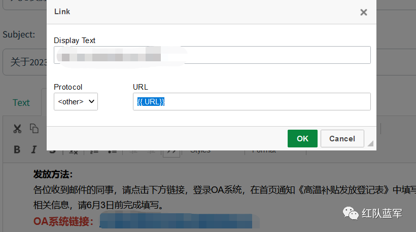 客户需求是将链接放置在邮件中,调取受害者输入信息,因此这里crtl+k添加了链接,URL添加{{.URL}}即可。