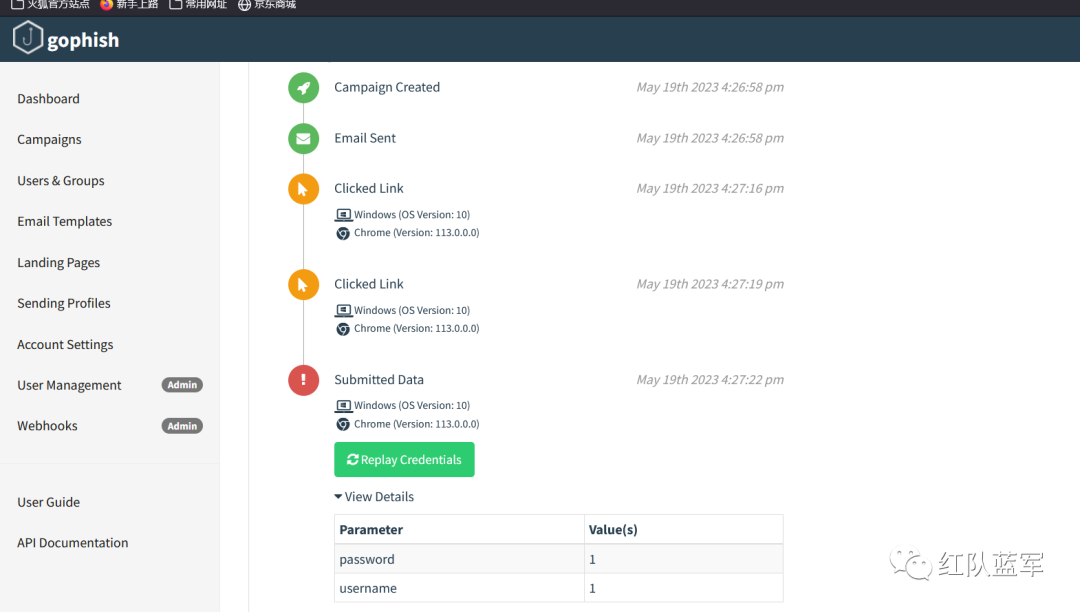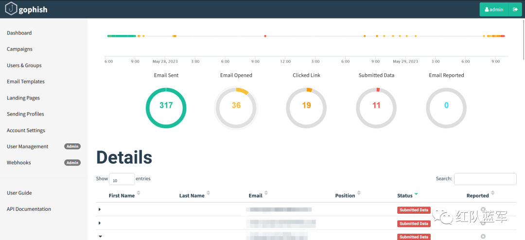 部署完后就是静候佳音,等待鱼儿上钩了。最后在Dashboard中可以很直观的看到用户打开邮件、点击链接、提交数据等行为的对应数量。
