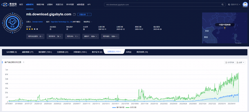 通过奇安信威胁情报中心的TIP对更新域名mb.download.gigabyte.com查询结果显示,客户端访问量级较大。