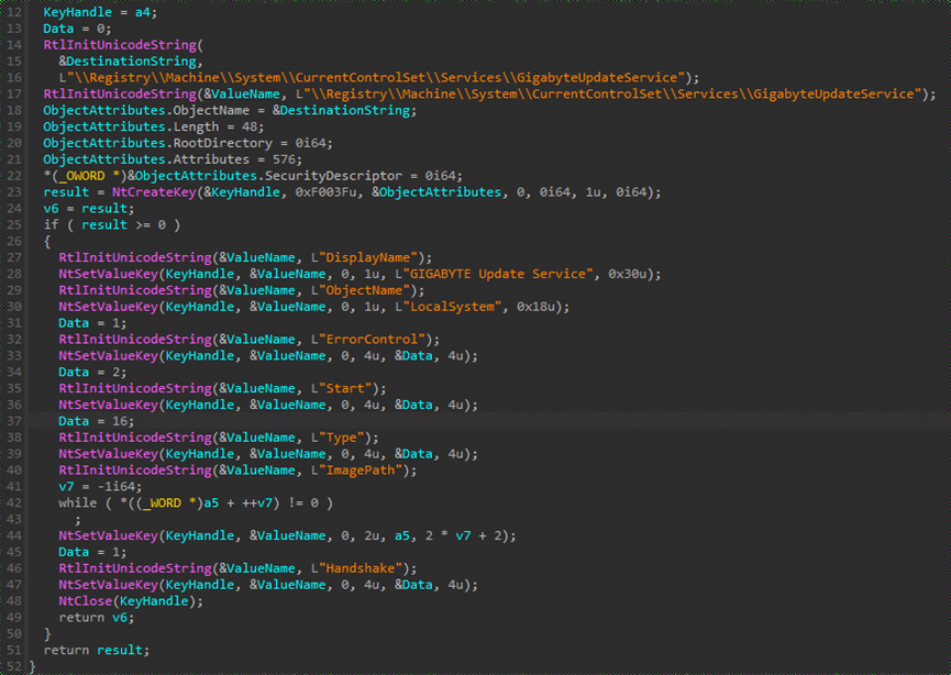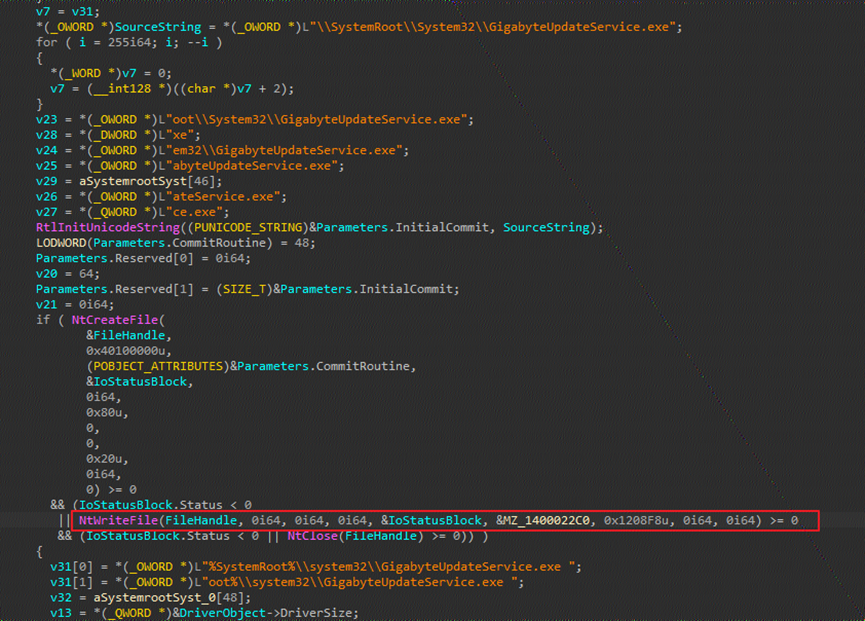该可执行文件执行后,使用Windows Native API将内嵌在自身的可执行文件的内容写入%SystemRoot%\system32\目录下,并命名为GigabyteUpdateService.exe。