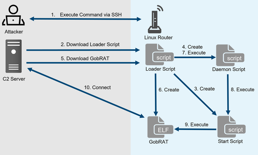 近日,研究人员披露了一个名为GobRAT的木马针对日本多个Linux路由器发起攻击。攻击者首先针对WEB界面对公网开放的路由器,利用漏洞执行命令,外联C2获取加载器,下载GobRAT木马。加载器的功能包括禁用防火墙、在/root/.ssh/authorized_keys中注册SSH公钥、创建启动权限维持脚本、下载对应目标机器架构的GobRAT木马。