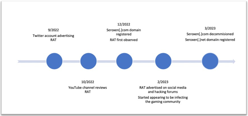 SeroXen 是一种新的远程访问木马 (RAT),于 2022 年底出现,并在 2023 年变得越来越流行。它被宣传为一种合法工具,可以在不被发现的情况下访问 计算机,它的售价仅为每月30美元获得许可证或60美元终生捆绑,使其易于访问。SeroXen 是一种无文件 RAT,在逃避静态和动态分析检测方面表现良好。该恶意软件结合了多个开源项目以提高其功能。它是 Quasar RAT、r77-rootkit 和命令行 NirCmd 的组合。SeroXen 的大多数受害者都在游戏社区,但随着该工具越来越受欢迎,目标范围可能会扩大到包括大型公司和组织。