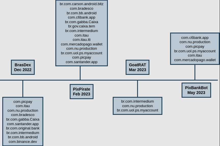 时间线显示,2022 年 12 月发现的 BrasDex 在野外运行了很长一段时间。相比之下,最近发现的 PixPirate 和GoatRAT银行木马非常活跃并继续传播,专门针对巴西银行用户。