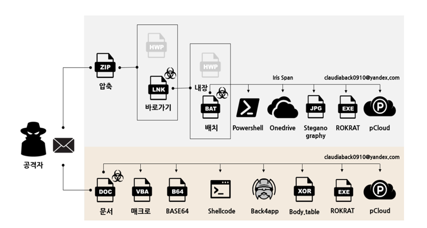 从 4 月到 5 月,研究人员抓获了一些与朝鲜有联系的威胁行为者,以组织名称 APT37(RedEyes,Group123)为人所知,他们试图以恶意 MS Word DOC 文档文件和 LNK 快捷方式文件的形式进行攻击。以在国内的朝鲜人权界负责人的情报为幌子,以另一名朝鲜人权界代表为对象,进行了包含恶意文件的基于电子邮件的鱼叉式网络钓鱼攻击,类似的攻击仍在继续。APT37组织是FireEye命名的朝鲜背后的黑客组织,从2012年前后开始参与各种网络间谍活动。该组织的主要任务之一是以获取对朝鲜政权有利的情报为目的的侦察活动,在韩国的公共部门和私营部门开展范围广泛的黑客活动。