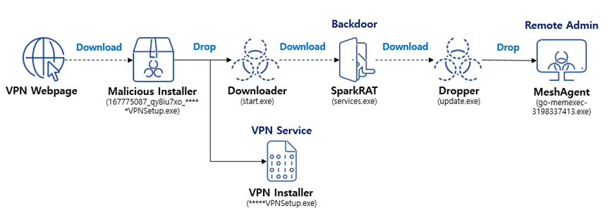 在5月初,韩国某VPN软件(用户多为中国用户)被公布其安装程序携带恶意软件SparkRAT,攻击者通过入侵正常使用的VPN服务分发恶意代码,后续该问题已被解决。但近期,研究人员再次监测到这家VPN公司的安装程序携带SparkRAT,分析其攻击特征后,判断此次行动与上次行动为同一攻击者。