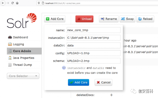 从服务器的文件目录来看,每个core在{Base Dir}/server/solr/{Core name}里面都有一个命名目录。在同一级别,还有一个名为 configsets 的默认目录,其中包含 Solr 核心示例及其所需文件。我很快发现可以使用此目录中存在的默认配置文件来创建虚拟核心。这种创建是可能的,因为没有限制 InstanceDir 变量的路径。因此,即使在全新的 Solr 安装上,也可以访问至少一个核心及其功能。参数 instanceDir 和 dataDir 可以设置为任何绝对或相对路径,这可以简化攻击。