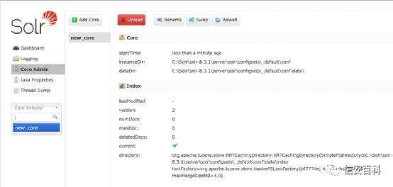 Apache Solr 基于Cores。每个core都是一个独立的数据库,可以从网络界面查询和删除。也可以创建新的cores,但用户必须事先手动将配置文件上传到服务器。