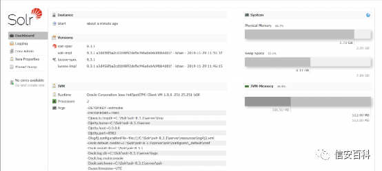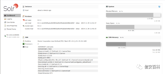 在主页面上,会显示大量系统信息,比如服务器上的不同路径,以及Solr的版本等。在以下屏幕截图的左侧,没有可用的cores。