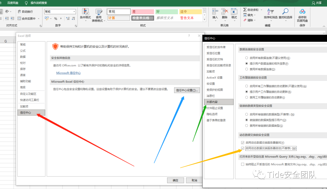 在Office的"文件->选项->信任中心"处开启"启用动态数据交换服务器启动"功能: