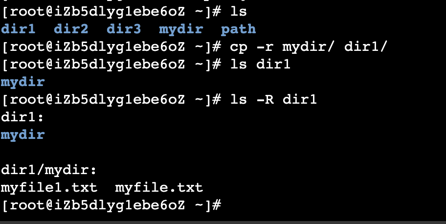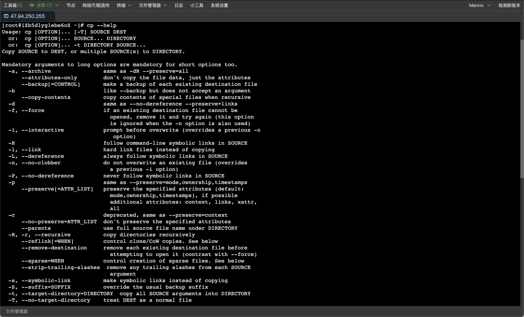 [[email protected] ~]# cp --helpUsage: cp [OPTION]... [-T] SOURCE DESTor: cp [OPTION]... SOURCE... DIRECTORYor: cp [OPTION]... -t DIRECTORY SOURCE...Copy SOURCE to DEST, or multiple SOURCE(s) to DIRECTORY.Mandatory arguments to long options are mandatory for short options too.-a, --archive same as -dR --preserve=all--attributes-only don't copy the file data, just the attributes--backup[=CONTROL] make a backup of each existing destination file-b like --backup but does not accept an argument--copy-contents copy contents of special files when recursive-d same as --no-dereference --preserve=links-f, --force if an existing destination file cannot beopened, remove it and try again (this optionis ignored when the -n option is also used)-i, --interactive prompt before overwrite (overrides a previous -noption)-H follow command-line symbolic links in SOURCE-l, --link hard link files instead of copying-L, --dereference always follow symbolic links in SOURCE-n, --no-clobber do not overwrite an existing file (overridesa previous -i option)-P, --no-dereference never follow symbolic links in SOURCE-p same as --preserve=mode,ownership,timestamps--preserve[=ATTR_LIST] preserve the specified attributes (default:mode,ownership,timestamps), if possibleadditional attributes: context, links, xattr,all-c deprecated, same as --preserve=context--no-preserve=ATTR_LIST don't preserve the specified attributes--parents use full source file name under DIRECTORY-R, -r, --recursive copy directories recursively--reflink[=WHEN] control clone/CoW copies. See below--remove-destination remove each existing destination file beforeattempting to open it (contrast with --force)--sparse=WHEN control creation of sparse files. See below--strip-trailing-slashes remove any trailing slashes from each SOURCEargument-s, --symbolic-link make symbolic links instead of copying-S, --suffix=SUFFIX override the usual backup suffix-t, --target-directory=DIRECTORY copy all SOURCE arguments into DIRECTORY-T, --no-target-directory treat DEST as a normal file-u, --update copy only when the SOURCE file is newerthan the destination file or when thedestination file is missing-v, --verbose explain what is being done-x, --one-file-system stay on this file system-Z set SELinux security context of destinationfile to default type--context[=CTX] like -Z, or if CTX is specified then set theSELinux or SMACK security context to CTX--help display this help and exit--version output version information and exitBy default, sparse SOURCE files are detected by a crude heuristic and thecorresponding DEST file is made sparse as well. That is the behaviorselected by --sparse=auto. Specify --sparse=always to create a sparse DESTfile whenever the SOURCE file contains a long enough sequence of zero bytes.Use --sparse=never to inhibit creation of sparse files.When --reflink[=always] is specified, perform a lightweight copy, where thedata blocks are copied only when modified. If this is not possible the copyfails, or if --reflink=auto is specified, fall back to a standard copy.Use --reflink=never to ensure a standard copy is performed.The backup suffix is '~', unless set with --suffix or SIMPLE_BACKUP_SUFFIX.The version control method may be selected via the --backup option or throughthe VERSION_CONTROL environment variable. Here are the values:none, off never make backups (even if --backup is given)numbered, t make numbered backupsexisting, nil numbered if numbered backups exist, simple otherwisesimple, never always make simple backupsAs a special case, cp makes a backup of SOURCE when the force and backupoptions are given and SOURCE and DEST are the same name for an existing,regular file.GNU coreutils online help: <https://www.gnu.org/software/coreutils/>Full documentation <https://www.gnu.org/software/coreutils/cp>or available locally via: info '(coreutils) cp invocation'[[email protected] ~]# cp --helpUsage: cp [OPTION]... [-T] SOURCE DESTor: cp [OPTION]... SOURCE... DIRECTORYor: cp [OPTION]... -t DIRECTORY SOURCE...Copy SOURCE to DEST, or multiple SOURCE(s) to DIRECTORY.Mandatory arguments to long options are mandatory for short options too.-a, --archive same as -dR --preserve=all--attributes-only don't copy the file data, just the attributes--backup[=CONTROL] make a backup of each existing destination file-b like --backup but does not accept an argument--copy-contents copy contents of special files when recursive-d same as --no-dereference --preserve=links-f, --force if an existing destination file cannot beopened, remove it and try again (this optionis ignored when the -n option is also used)-i, --interactive prompt before overwrite (overrides a previous -noption)-H follow command-line symbolic links in SOURCE-l, --link hard link files instead of copying-L, --dereference always follow symbolic links in SOURCE-n, --no-clobber do not overwrite an existing file (overridesa previous -i option)-P, --no-dereference never follow symbolic links in SOURCE-p same as --preserve=mode,ownership,timestamps--preserve[=ATTR_LIST] preserve the specified attributes (default:mode,ownership,timestamps), if possibleadditional attributes: context, links, xattr,all-c deprecated, same as --preserve=context--no-preserve=ATTR_LIST don't preserve the specified attributes--parents use full source file name under DIRECTORY-R, -r, --recursive copy directories recursively--reflink[=WHEN] control clone/CoW copies. See below--remove-destination remove each existing destination file beforeattempting to open it (contrast with --force)--sparse=WHEN control creation of sparse files. See below--strip-trailing-slashes remove any trailing slashes from each SOURCEargument-s, --symbolic-link make symbolic links instead of copying-S, --suffix=SUFFIX override the usual backup suffix-t, --target-directory=DIRECTORY copy all SOURCE arguments into DIRECTORY-T, --no-target-directory treat DEST as a normal file-u, --update copy only when the SOURCE file is newerthan the destination file or when thedestination fil