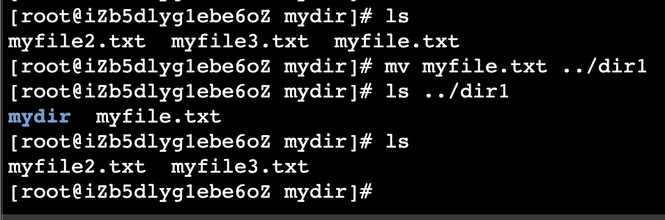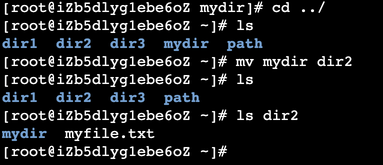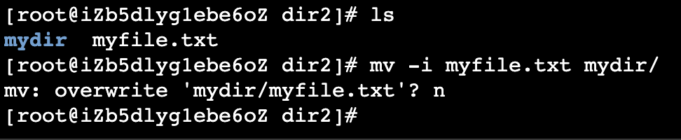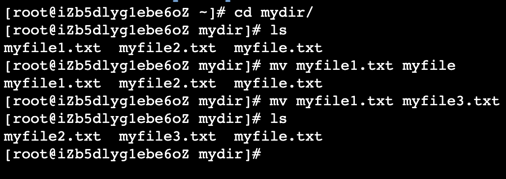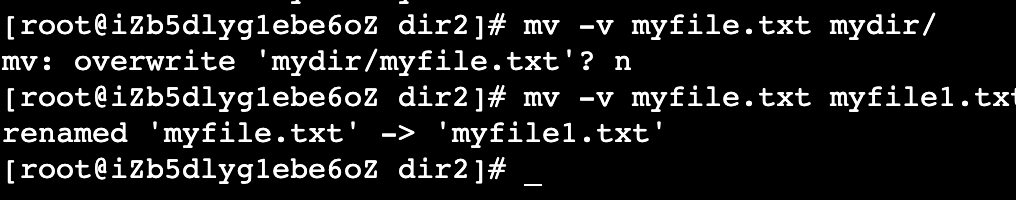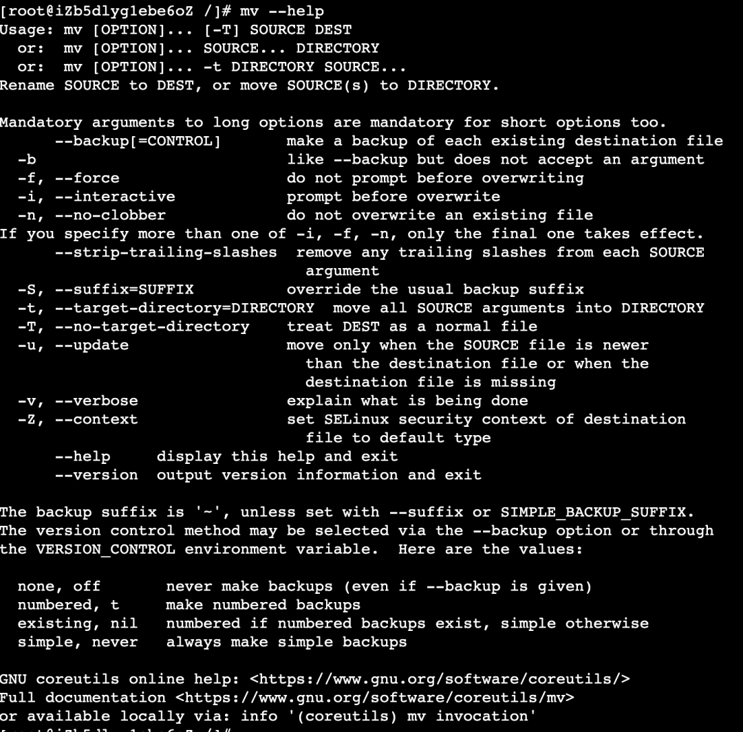 mv oldname.txt newname.txtmv sourcedir/ destination/mv -i file.txt destination/mv -v file.txt destination/[[email protected] /]# mv --helpUsage: mv [OPTION]... [-T] SOURCE DESTor: mv [OPTION]... SOURCE... DIRECTORYor: mv [OPTION]... -t DIRECTORY SOURCE...Rename SOURCE to DEST, or move SOURCE(s) to DIRECTORY.Mandatory arguments to long options are mandatory for short options too.--backup[=CONTROL] make a backup of each existing destination file-b like --backup but does not accept an argument-f, --force do not prompt before overwriting-i, --interactive prompt before overwrite-n, --no-clobber do not overwrite an existing fileIf you specify more than one of -i, -f, -n, only the final one takes effect.--strip-trailing-slashes remove any trailing slashes from each SOURCEargument-S, --suffix=SUFFIX override the usual backup suffix-t, --target-directory=DIRECTORY move all SOURCE arguments into DIRECTORY-T, --no-target-directory treat DEST as a normal file-u, --update move only when the SOURCE file is newerthan the destination file or when thedestination file is missing-v, --verbose explain what is being done-Z, --context set SELinux security context of destinationfile to default type--help display this help and exit--version output version information and exitThe backup suffix is '~', unless set with --suffix or SIMPLE_BACKUP_SUFFIX.The version control method may be selected via the --backup option or throughthe VERSION_CONTROL environment variable. Here are the values:none, off never make backups (even if --backup is given)numbered, t make numbered backupsexisting, nil numbered if numbered backups exist, simple otherwisesimple, never always make simple backupsGNU coreutils online help: <https://www.gnu.org/software/coreutils/>Full documentation <https://www.gnu.org/software/coreutils/mv>or available locally via: info '(coreutils) mv invocation'