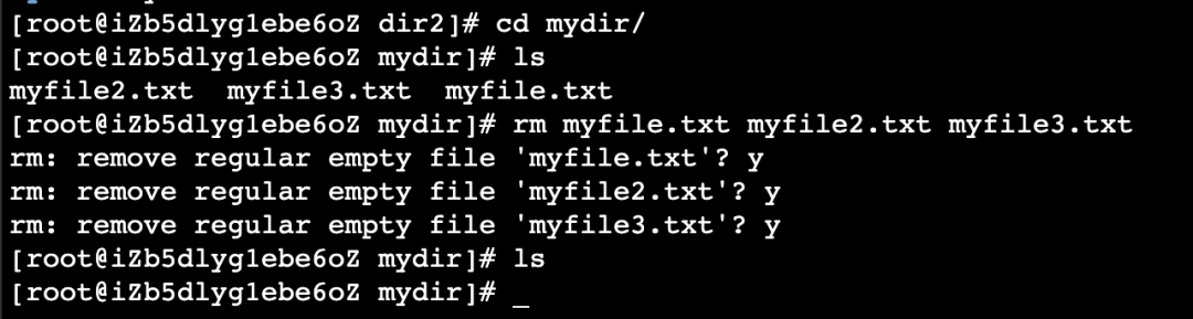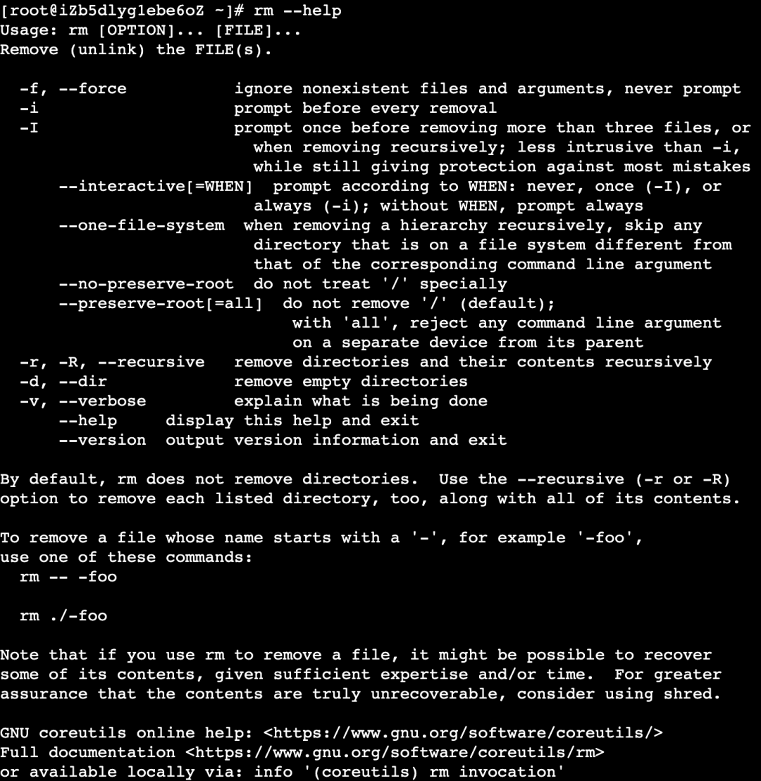 [[email protected] ~]# rm --helpUsage: rm [OPTION]... [FILE]...Remove (unlink) the FILE(s).-f, --force ignore nonexistent files and arguments, never prompt-i prompt before every removal-I prompt once before removing more than three files, orwhen removing recursively; less intrusive than -i,while still giving protection against most mistakes--interactive[=WHEN] prompt according to WHEN: never, once (-I), oralways (-i); without WHEN, prompt always--one-file-system when removing a hierarchy recursively, skip anydirectory that is on a file system different fromthat of the corresponding command line argument--no-preserve-root do not treat '/' specially--preserve-root[=all] do not remove '/' (default);with 'all', reject any command line argumenton a separate device from its parent-r, -R, --recursive remove directories and their contents recursively-d, --dir remove empty directories-v, --verbose explain what is being done--help display this help and exit--version output version information and exitBy default, rm does not remove directories. Use the --recursive (-r or -R)option to remove each listed directory, too, along with all of its contents.To remove a file whose name starts with a '-', for example '-foo',use one of these commands:rm -- -foorm ./-fooNote that if you use rm to remove a file, it might be possible to recoversome of its contents, given sufficient expertise and/or time. For greaterassurance that the contents are truly unrecoverable, consider using shred.GNU coreutils online help: <https://www.gnu.org/software/coreutils/>Full documentation <https://www.gnu.org/software/coreutils/rm>or available locally via: info '(coreutils) rm invocation'