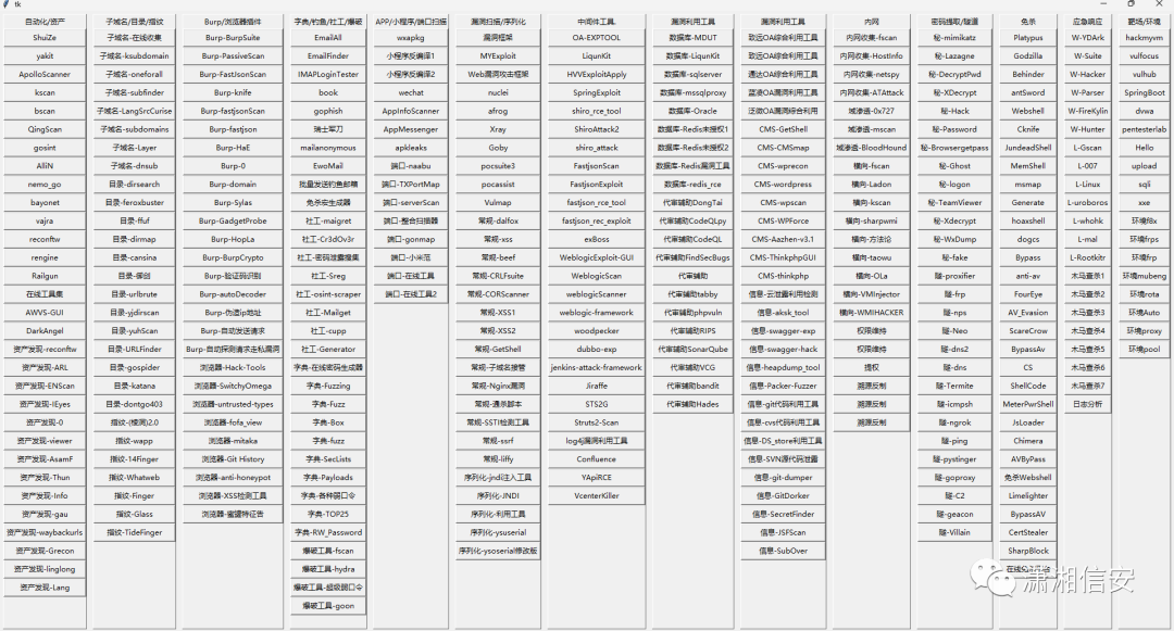 此工具集成资产探测半自动化,WEB渗透,burp及浏览器插件,社工钓鱼,APP小程序渗透,批量漏洞扫描,漏洞利用,内网渗透,隧道代理,免杀,Windows及linux应急响应,训练靶场环境部署等工具指引!