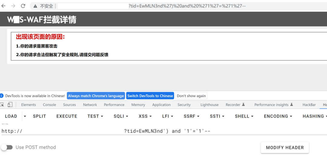 在 tid=EwMLN3nd') 后面添加 and '1'='1' -- ,发现也是W*S-WAF拦截,版本号:Server: w*s/1.6 。
