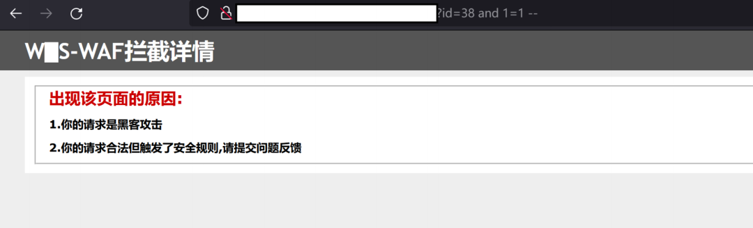 在 id=38 后面添加 and 1=1 -- ,发现 W*S-WAF 拦截,版本号:Server: w*s/1.6 。