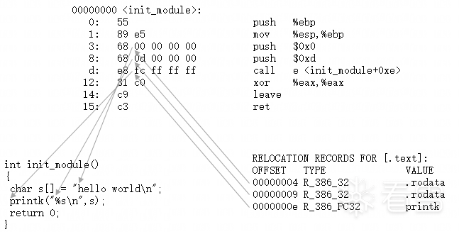 ⑤ 如果称号名称为”init_module”,根据Elf32_Sym的st_shndx和st_value成员,最终找到由init_module()函数编译出来的机器码,在.text节区中的某个位置。----[ 2.1 - The .symtab section