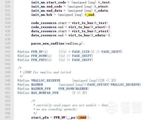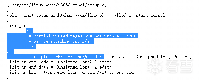 除此以外,还要解决另外一个问题,先看一下内容启动过程中执行的代码:图中鼠标选中部分,估计是作者复制错了位置,以下根据linux-2.4.0内核代码截取(https://elixir.bootlin.com/linux/2.4.0/source/arch/i386/kernel/setup.c#L598):图中的代码,将_end(即.bss节区的结束地址)赋值给了init_mm.brk和start_pfn,其中,start_pfn的值是个页面号,代表可供内核动态分配的第一个页面。显然,这个值需要调整,跳过紧接在.bss节区后面的LKM内容,否则内核的动态分配+写操作,会将加载到内存中的LKM覆盖掉。--[ 4 - Relocate the symbol in module file
