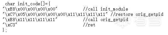 解决以上所有问题之后,还得找个时机,触发捆绑LKM的加载,也就是调用LKM的init_module()函数。jbtzhm提供的方法是,再在dummy data与捆绑LKM之间,添加如下指令块:然后,再修改内核的系统调用表,具体来说,就是将SYS_getpid系统调用号对应的表项(因为reboot时,该系统调用一定会被执行,很多程序(比如init)都会调用getpid()函数),修改为init_code[]的地址,进入init_code[]后,就会在真正调用sys_getpid()之前,悄悄先加载捆绑的LKM。