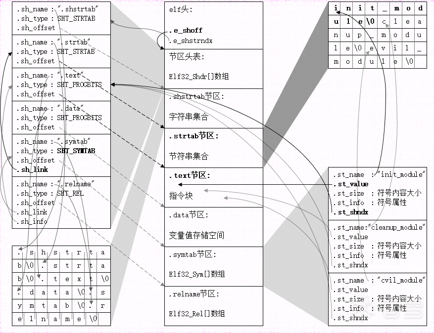 有些elf文件,下一步要由静态ld处理(比如.o、.ko文件),或由动态ld处理(比如.so文件),有些elf文件,加载到内存就可以直接运行(比如可执行文件、内核文件),而不管哪一种elf文件类型,都要为下一步处理,提供足够的信息,所以,elf文件类型不同,具体的组成内容是有区别的。另外,首次学习elf格式时,很容易被大量的结构体,搞的眼花缭乱,这里先放一张示意图,展示了部分重要结构体之间的联系,用于辅助理解后续内容:比如:init_module()函数体文件内偏移的查找过程为: