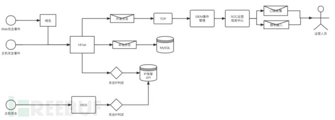 SIEM:威胁事件管理系统用来处理,TDP接入的蜜罐威胁事件日志, 由TDP转发给SIEM或者,由HFish直接发给SIEM,蜜罐威胁日志成为多条威胁数据管道处理中的一条支流处理分支,然后由SIEM与SOC进行后续的交互,进行威胁的收敛研判。
