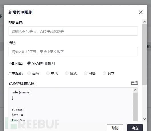 HFish还提供威胁风险的检测识别能力,并且可以自己通过YARA,进行自定义检测规则的编写。