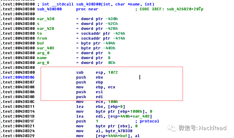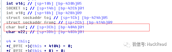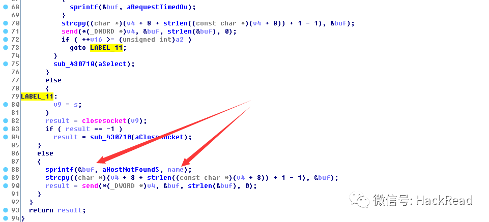 我们使用 F5 看一下源码,可以看到,我们的主机传进去就是 name ,然后我们会将其赋值到 buf 的缓冲区空间,然后造成了溢出