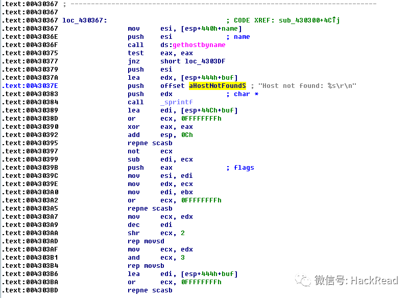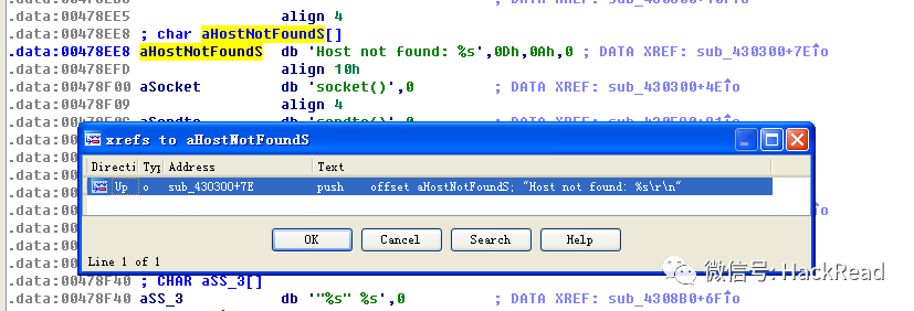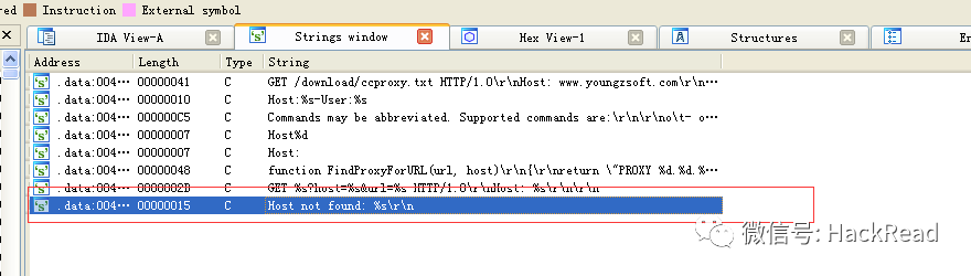 首先等待 ida 将程序装载完整,为了快速定位我们首先打开 string 窗口,对我们可能的溢出点进行搜索,特征就是 “Host not found…” 这个字符串