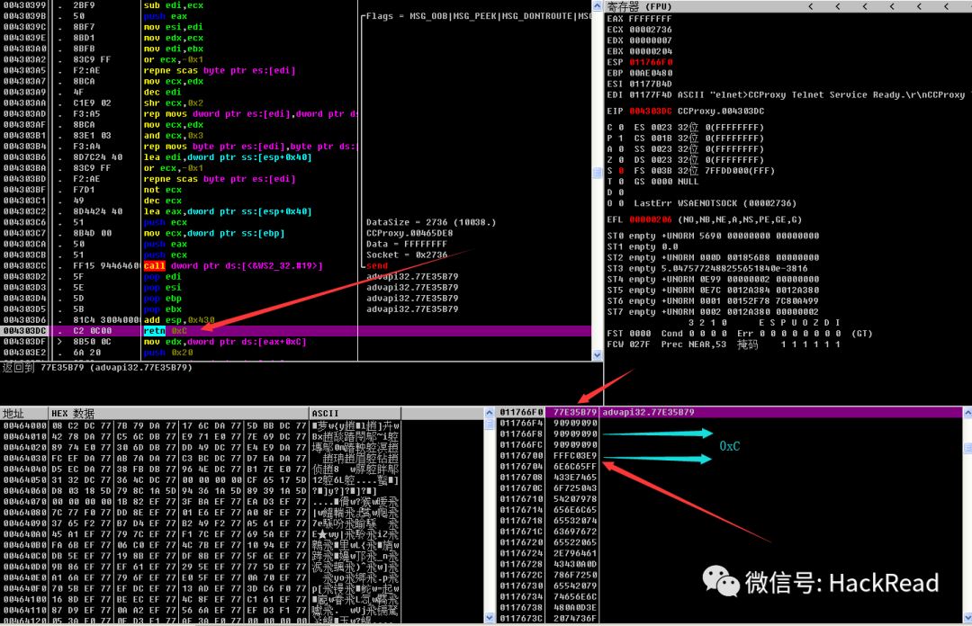 首先我们要关注到 retn 0xC ,这说明在执行完这条指令的时候 esp 不只是会向高地址移动 4 字节,还会再继续向高地址移动 0xC 个字节,然后我们再来看右下角的栈区,我们发现此时 esp 移动后指向的是 0xFFFC03E9 ,这个刚好是我们 exp 中的 jmp 变量的值,并且这是一个负数,也就是一个相对的向低地址跳转的指令,也就是说虽然我们在 exp 中看似 jmp 在 shellcode 前面,但是实际上到了栈空间以后还是有所变化的