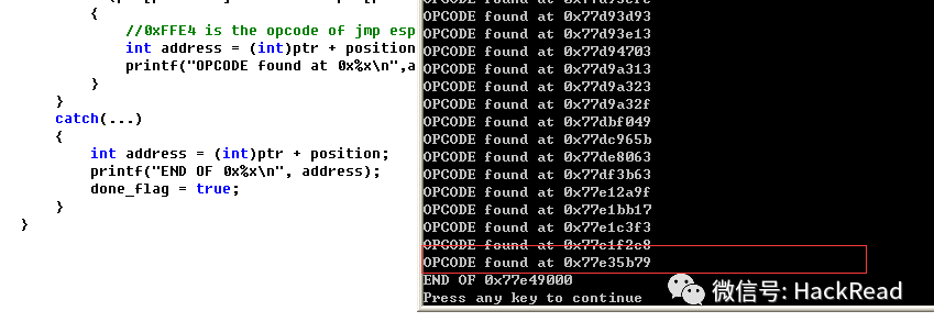 通过这个程序的运行,我们能找到很多的 jmp esp 的地址,我这里选择的是最后一个