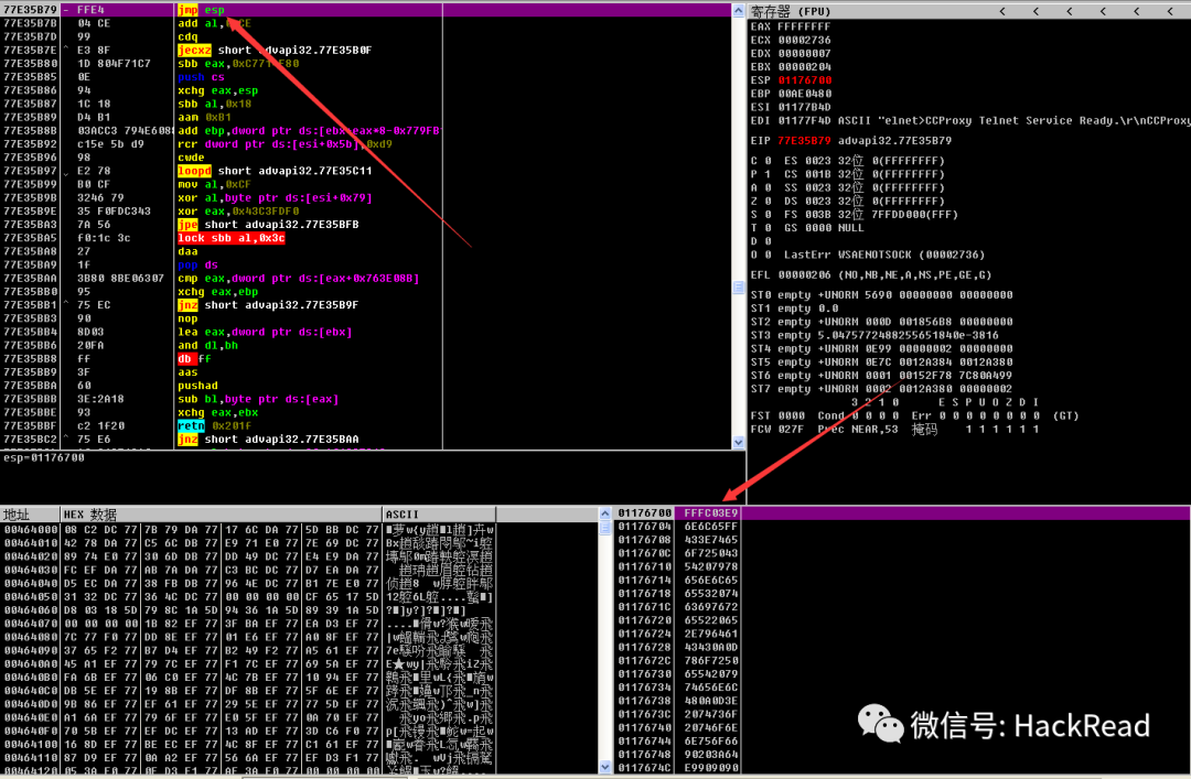 然后我们调到 jmp esp 的地址 ,执行 jmp esp