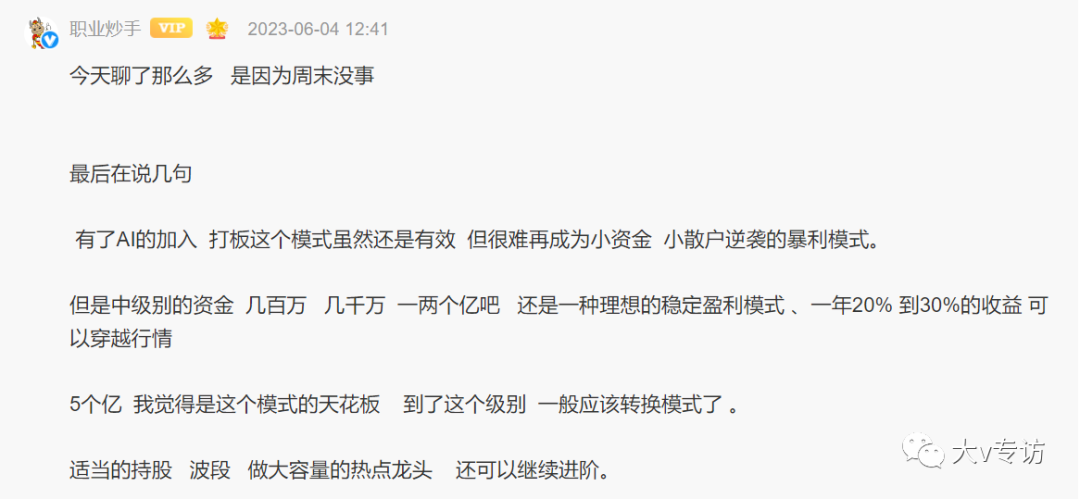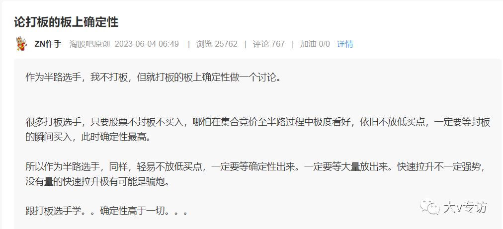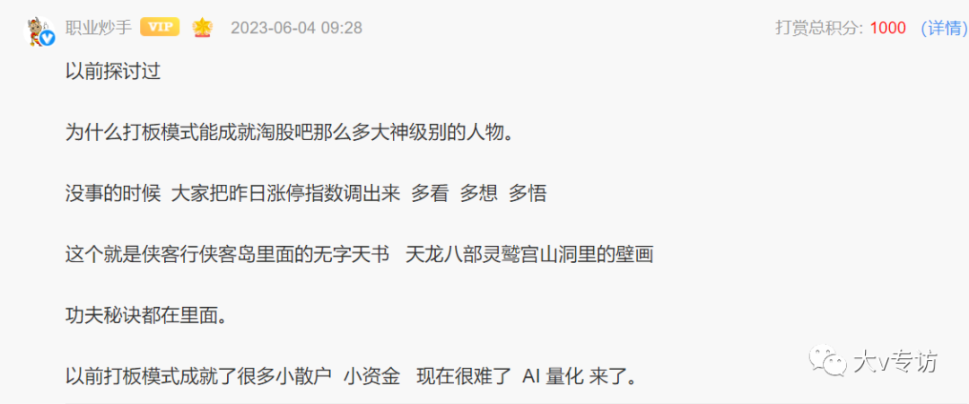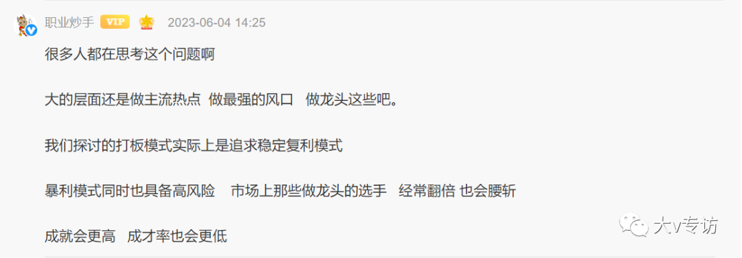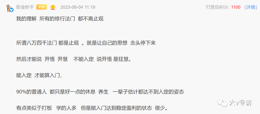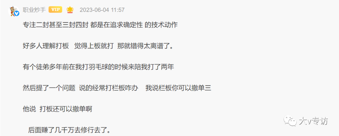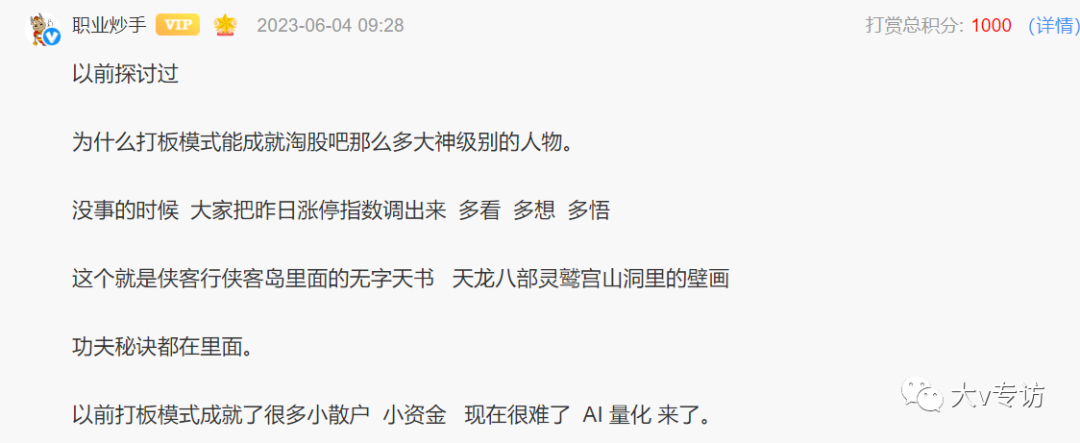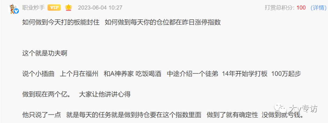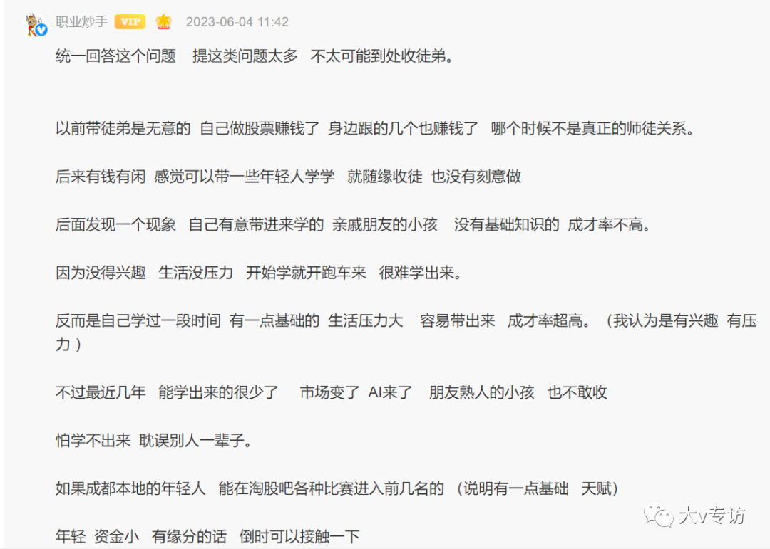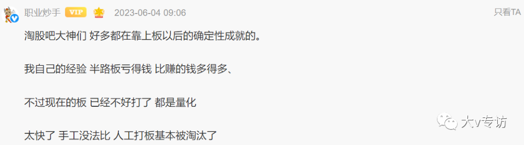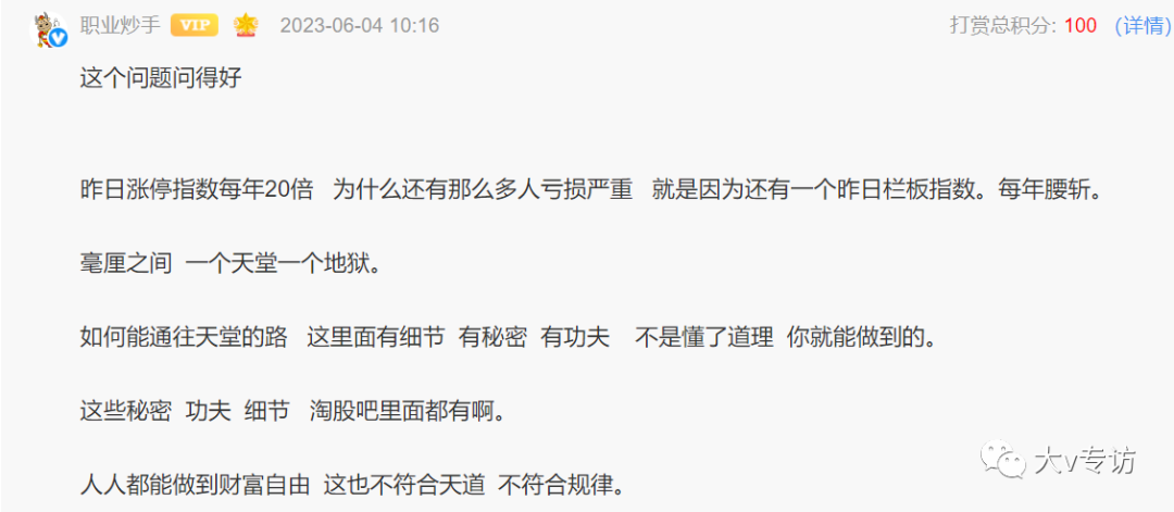 大V专访今天一位老铁发表了一篇观点,居然把职业炒手给炸出来了而且还是沙发评论看到很多很有价值的思路分享给大家问题一问题二问题三问题四问题五问题六问题七问题八闲聊大家最关心的收徒条件!!!职业炒手真的是
